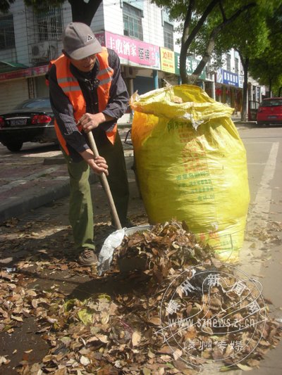 张师傅介绍,官河路与艇湖路交叉处至别墅区一带是他负责清扫的,每天早上4点开始工作,一直扫到晚7点,中午才有休息时间。因为这两天落叶多,一天要装12大袋落叶,每袋有50多公斤重。