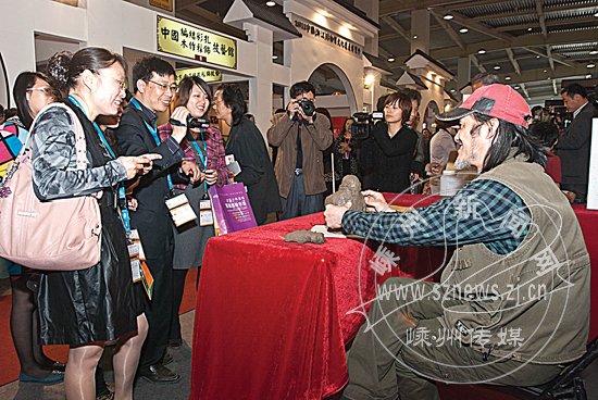 宓风光,郑剑夫,刘长泉,这次带着各自的绝活来到义乌文博会。宓风光照例是一团黑色的泥巴,郑剑夫是一截树根和刀凿工具,刘长泉则带着细如发丝的竹篾和编了一半的马。他们分别向现场的领导和来宾展示泥塑、根雕和竹编的精致艺术。