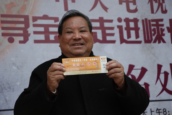 中央电视台《寻宝·走进嵊州》海选入场券的朋友,开心地将入场券平举在胸前向我们展示.......