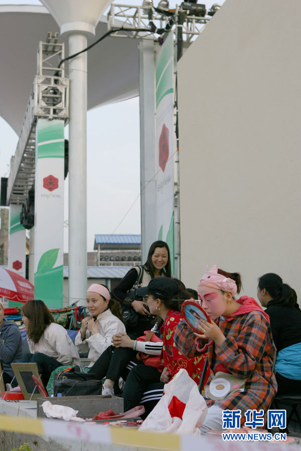 4月28日晨,演员们在世园会园区化妆准备上午的演出。新华社发(徐子鉴摄)