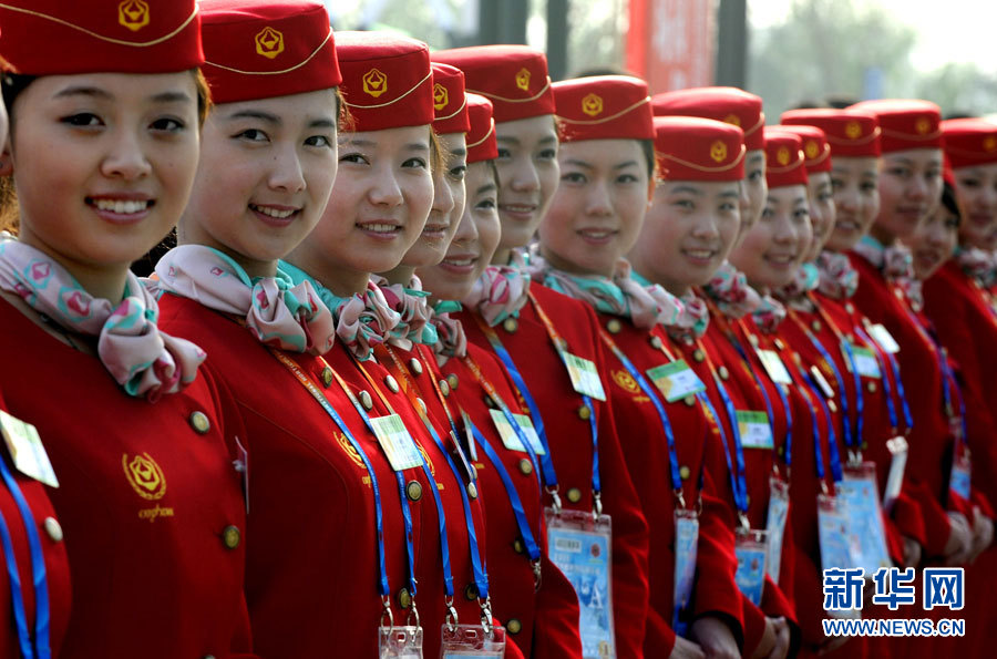 4月28日晨,花卉大使在西安世园会主入口欢迎来宾。新华社记者陶明摄