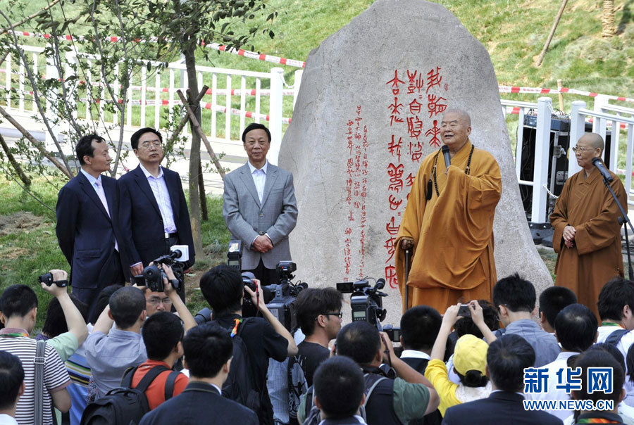 4月27日,台湾佛光山开山宗长星云大师(右二)为诗碑揭幕。