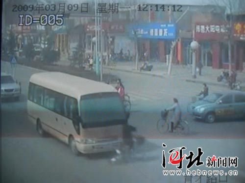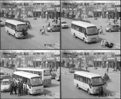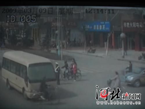 (左上图、右上图)2009年3月9日12时14分12秒,李小林骑车由南向北驶过路口,与第3辆中巴车相撞。