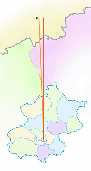 具体的测算结果是这样:北京永定门纬度线至古开平中心纬度线距离约270多公里。古开平往西偏离北京子午线约17公里。北京至古开平连线与北京子午线的夹角为2至3度。这与北京中轴线偏离北京子午线的方向一致,偏离角度几乎吻合。这说明:当初建元大都时,中轴线是采取了开平(上都)与大都的连线作为基准线的!