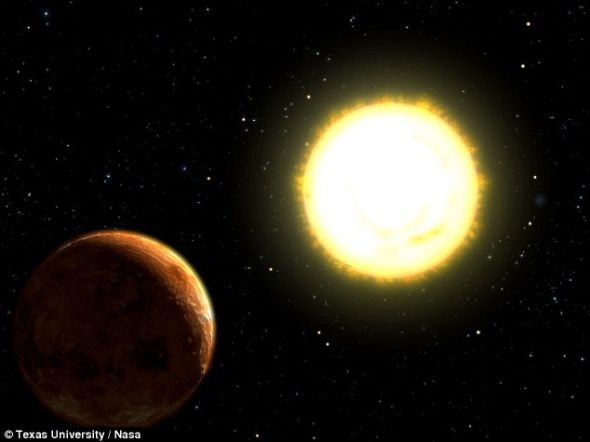 这颗多岩系外行星(左)的直径达到1.3万英里,比地球大60%,质量和密度分别是地球的8倍和2倍,绕Cancri a(右)轨道运行。