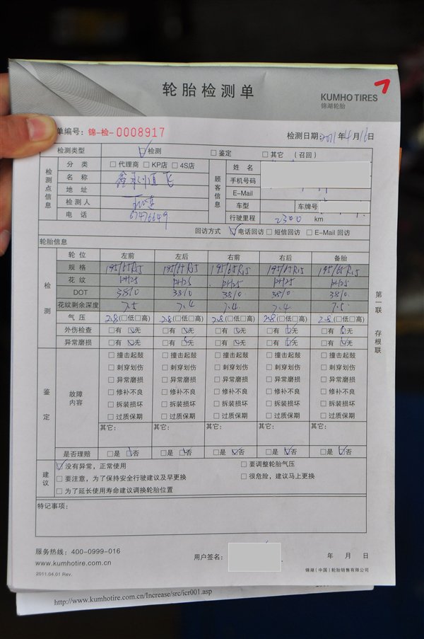 首先,锦湖轮胎指定检测点的工作人员为我们开了一张轮胎检测单,并详细查看了使用中的四条轮胎以及备胎的规格、花纹、DOT码及车辆的行驶里程。其中轮胎规格及DOT码是为了确定轮胎是否在召回批次范围内。据工作人员表示,记录花纹型号是为了记录轮胎的基本信息,而记录车辆的行驶里程是为了衡量车辆的基本行驶状况与轮胎的磨损情况是否正常。如果行驶里程较短,磨损情况较严重的话,维修点会给车主相关提示。