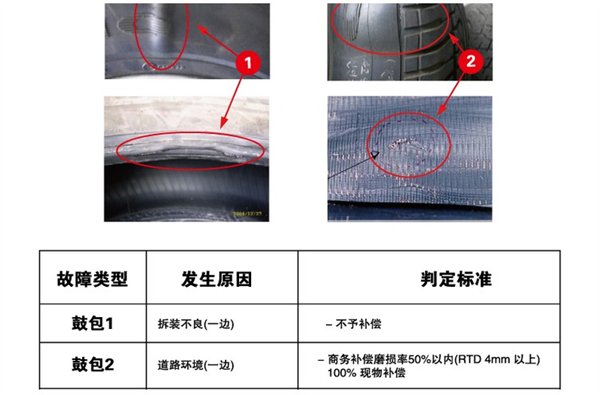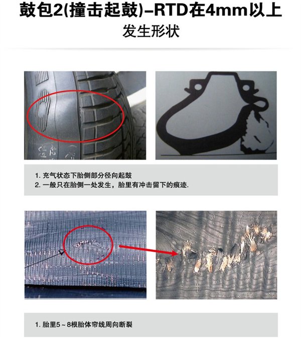 对于因撞击起鼓,并且RTD花纹剩余深度不小于4mm的情况,给予商务补偿: