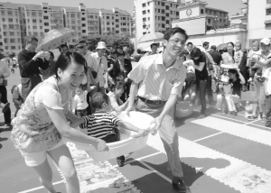笑声在场上回荡,童心在空中飞扬。为喜迎“六一”节到来,五爱幼儿园两年一届的亲子运动会近日在市文化广场举行,小朋友们与爸爸妈妈或爷爷奶奶、外公外婆共享着那份幸福与快乐。图为一家三口参加“抬小猪”比赛,让我们一起为他们加油哦!