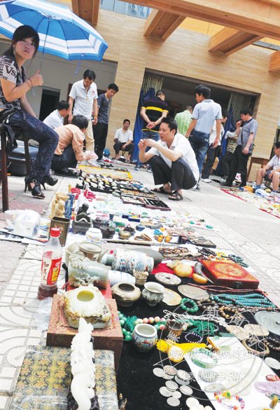 昨日上午,嵊州大道某酒店前人头攒动,来自省内外的20多名经营户在此设摊,引来了大批的淘宝者。据了解,这是央视《寻宝·走进嵊州》活动举行后,我市沉寂多时的“收藏品临时交易市场”首次开市交易。虽然市场上“藏品”多种多样,但刚见识过央视《寻宝》的藏友,对藏品的甄别已颇为谨慎。图为市民正在临时摊位选购。