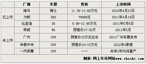从2010年中国汽车销量中SUV车型极具猛增的数量就可以看得出目前在国内市场最受欢迎的车型是什么。进入2011年后各大车企都加快了布局SUV产品的步伐。许多只生产轿车的厂家也看上了SUV市场的这块肥肉。从今年的上海车展上,我们已然看到了2011年自主品牌SUV市场的精彩。如比亚迪、上海汽车、华晨汽车、力帆等都将全面发起进攻,进军SUV市场。回顾上表所述的7款新SUV车型,已有近半数已经上市开始正式销售了,而其他车型也将在接下来的时间里与大家见面。接下来请您随小编一起来看看他们各自具体的表现如何。