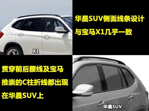 相比前脸的设计,华晨SUV的侧面几乎宝马X1如出一辙,贯穿前后的高腰线、侧面的车窗设计都与X1非常类似,甚至连宝马推崇的C柱折线也出现在华晨SUV上,以后上市后将很难从侧面分辨华晨SUV与X1,或许这就是华晨想要的效果。
