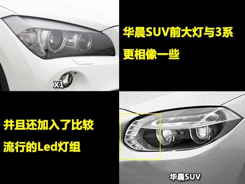 在前大灯设计上,宝马X1为双氙灯设计,而华晨SUV仅是加装了透镜,这应该是出于成本的考虑。而在整体造型上,宝马X1要犀利很多,而华晨SUV的大灯与3系更相像一些,不过比较流行的Led灯组出现在了华晨SUV上。