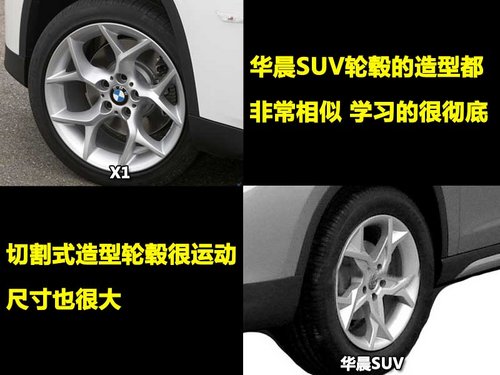 另外,华晨SUV的轮毂造型看起来相当的动感,切割式造型设计相当运动,这与宝马X1的轮毂有些神似,可见华晨学习的相当彻底。而从视觉感来看,华晨的SUV的轮毂尺寸比较大,与SUV车型的定位完美契合。