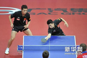 5月10日,中国运动员马龙(右)/许昕在比赛中。当日,在荷兰鹿特丹阿侯伊体育馆举行的2011年世界乒乓球(单项)锦标赛男双第二轮比赛中,马龙/许昕以4比0战胜法国运动员勒古/罗比诺,顺利晋级。新华社记者武巍摄