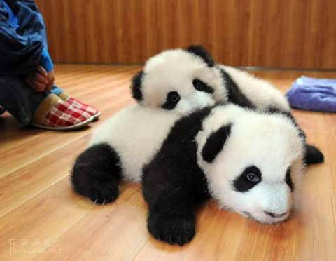 几个月大的熊猫宝宝在地板上爬来爬去,扭作一团,玩得非常开心。
