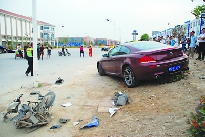 昨天下午4点半左右,南京市宁南汽配城门前的丁墙路上,一辆价值250万左右的宝马M6跑车,突然失控撞上一辆电动车,导致骑电动车的男子当场死亡。据目击市民称,这起事故是宝马跑车司机玩漂移酿的祸。事发前,那辆宝马跑车一直在丁墙路上高速转圈,在地面上留下了几十道“漂移”产生的轮胎痕迹。后来不知何故,汽车失控了,直接撞上了一名骑电动车的男子,当场将人撞飞出去3米远,电动车被撞散了架。据交管部门介绍,肇事司机并不是宝马跑车车主本人,但他也是位玩车的富家子弟。