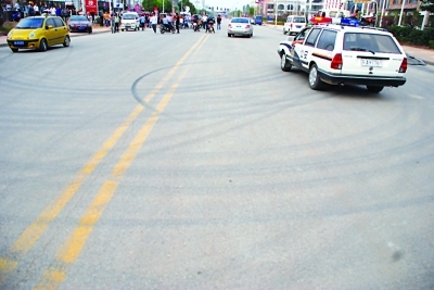记者在现场看到,在丁墙路上有两处大型的圆圈状的轮胎印。一处在汽配城南面出口处,地面上的轮胎痕迹有几十道,都是圆形分布,上面黑色轮胎印记十分明显。在宝马跑车车头前方三米左右的人行道边,快车道与人行道的分界处,地面上有两道深深的黑色轮胎印记。印记后方的马路上,以双黄线为中心,也有几十道轮胎印记。