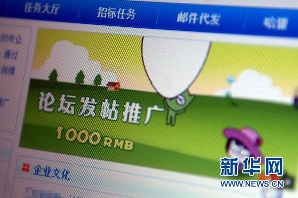 网络上的一家公关公司在其主页上明码标价1000元的一项论坛发帖推广广告(5月9日摄)。从4月份开始,中央外宣办、工业和信息化部、公安部、工商总局等四部门联手对非法网络公关行为开展为期两个月的整治,行动开展以来取得了一定成效。 新华社记者 黄宗治 摄