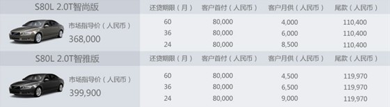 近日,沃尔沃汽车启动S计划理财专案,至6月30日之前,只需首付8万元,便可拥有S80L 2.0T智尚版或智雅版。具体见下表: