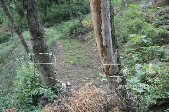 山林间的菜地和被砍了一圈的树(图中画圈处)