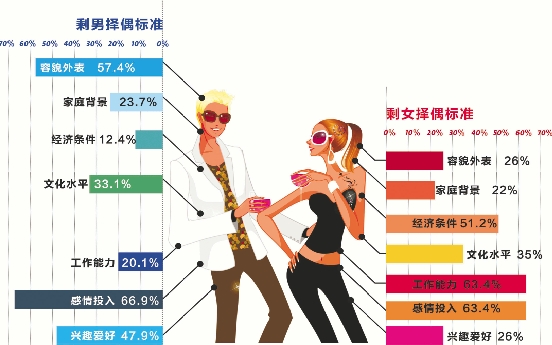 数据显示,“感情投入”是所有单身男女最普遍、最重视的择偶标准,但是在其他择偶标准方面,不同的城市则表现出有趣的差异。