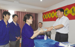 5月17日,浙江双鸟机械集团职工培训中心内人头攒动,热闹非凡,来自上海华东理工大学的老师、双鸟集团的领导及首批参加正规函授机电专业学习的25名学员欢聚一堂,举行正式开班典礼,集团董事长张文忠先生亲手为来自武汉籍务工者朱义香等25名学员发放大学课科书。