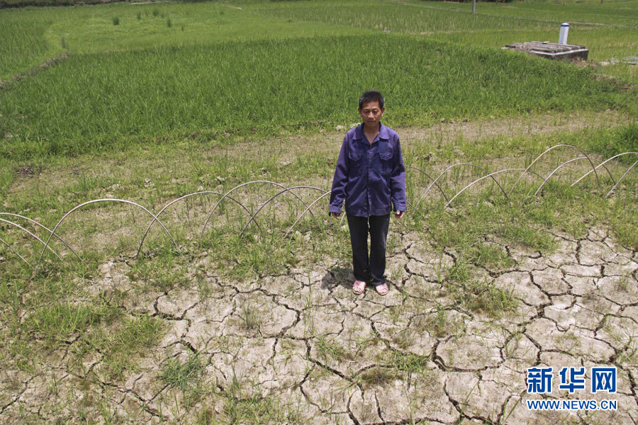 受降雨异常偏少影响,江西发生历史罕见的春夏连旱。目前,江西北部、西部的局部地区旱情严重,大面积稻田干涸开裂,早稻濒临绝收。据江西省防总介绍,目前江西全省已栽早稻受旱面积达533万亩,140多万亩中稻无水泡田翻耕,23.5万人口出现饮水困难。随着气温持续升高,江西的旱情仍在蔓延。 新华社发(邹海斌 摄)