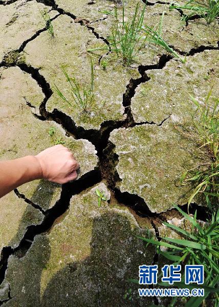 湖南岳阳洞庭湖裸露湖床上干旱造成的裂痕可伸进拳头(5月11日摄)。