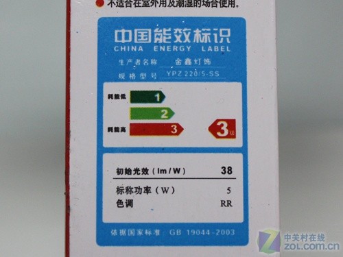 金鑫节能灯YPZ 220/5.SS的包装印刷质量一般,而且我们并没有找到产品使用说明书。在包装上除了能效标识以外,还简要的介绍了一些产品特点。