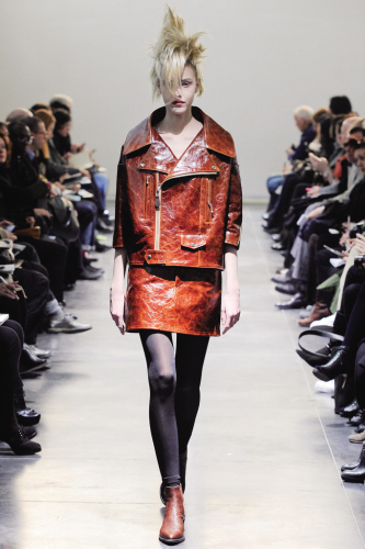 渡边淳弥(Junya Watanabe)的系列备受关注,设计师采用无处不在机车手夹克作为系列的引爆点,把它引申为无数意想不到的轮廓。把茧式针织衫和有质感的外套添加到这种混合中,你就拥有了一种非常可信的外观,有一点点乖僻,有一点点像朋克女郎。