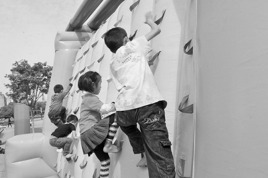5月15日,流动少年宫首现嵊州街头,10余个游乐设施,吸引了附近社区的孩子前来游玩。图为孩子们正在进行仿真攀岩。