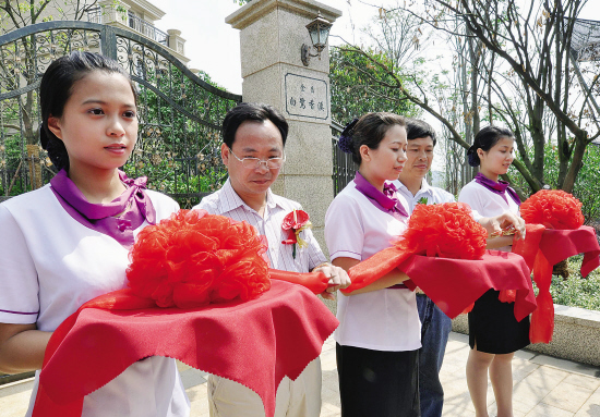 5月14日,占地228亩的嵊州湿地公园内,金昌·白鹭香溪低层景观实景样板体验区,迎来了第一批宾朋,他们走进“房前屋后不见电线、排水管,路面没有排水沟”的价值千万元的新式景观别墅群进行参观。图为剪彩现场。