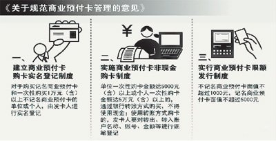 《意见》明确,要健全制度,规范行为。一是建立商业预付卡购卡实名登记制度。对于购买记名商业预付卡和一次性购买1万元(含)以上不记名商业预付卡的单位或个人,由发卡人进行实名登记。二是实施商业预付卡非现金购卡制度。单位一次性购卡金额达5000元(含)以上或个人一次性购卡金额达5万元(含)以上的,通过银行转账方式购买,不得使用现金;使用转账方式购卡的,发卡人要对转出、转入账户名称、账号、金额等进行逐笔登记。三是实行商业预付卡限额发行制度。不记名商业预付卡面值不超过1000元,记名商业预付卡面值不超过5000元。