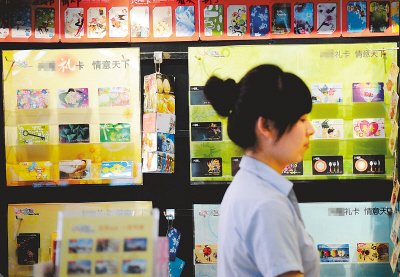 5月25日,一位沈阳市民在一商场内摆放的各种预付卡旁经过。张文魁摄(人民图片)