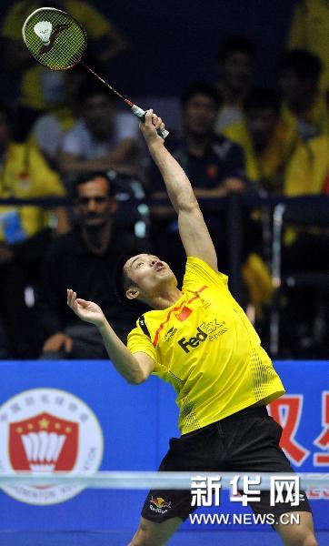 5月24日,中国选手林丹在男子单打比赛中以2比0战胜日本选手佐佐木翔。当日,在山东省青岛市举行的2011年苏迪曼杯世界羽毛球混合团体锦标赛第一级别A组的一场比赛中,中国队暂时以3比0胜日本队,锁定了小组头名出线。新华社记者朱峥摄