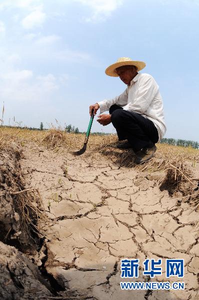 岳阳君山区一农户无奈面对自家干涸绝收的耕地(5月11日摄)。