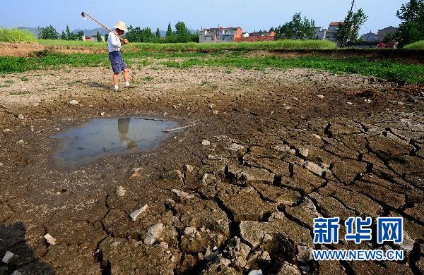 湖北省麻城市阎河镇蔡家垸村村民从一处干涸的堰塘前走过(5月4日摄)。新华社记者 程敏 摄