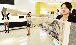 元代黄公望的《富春山居图》被誉为“画中之兰亭序”,是中国十大传世名画之一。《富春山居图》合壁展将于6月1日在台北故宫博物院举行,引来世人极大关注。嵊州浙江巴贝集团看好其中的商机,最近与浙江理工大学艺术与设计学院联合制作了《富春山居图》真丝艺术织锦长卷,该长卷长1130cm,高37cm,采用世界领先的数码织造技术,以100%优质蚕桑丝织造,将分居两岸的《富春山居图》合织为一。昨天,这一作品在嵊州浙江巴贝集团总部展示厅亮相。 【来源:天天商报】