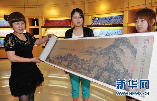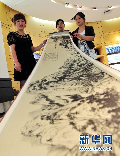 5月25日,工作人员展示《富春山居图》织锦长卷。新华社发(张亮宗 摄)