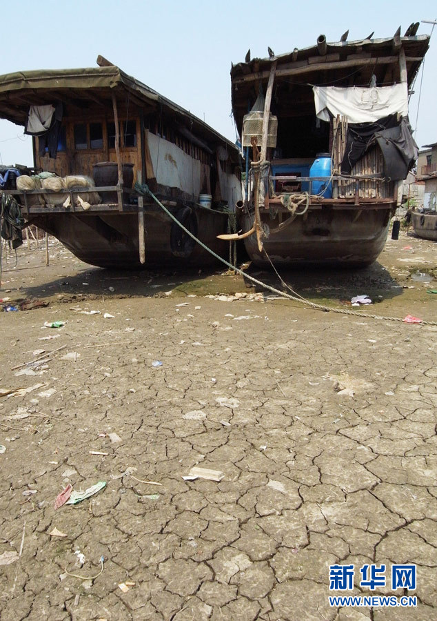 部分船舶已成为“旱船”,排列在干涸龟裂的淮河江苏段河床上(5月16日拍摄)。今年以来,江苏全省降雨较少。目前,全省部分地区旱情已达60年来最严重程度,一些湖泊干涸,淮河下游断流,太湖水位处于历史最低水位。目前除局部地区外,全省工农业生产和居民生活还未受到严重影响。水利专家认为,如果旱情持续,即将到来的夏种将面临用水难题,对航运也将产生较大影响。 新华社发(周海军 摄)