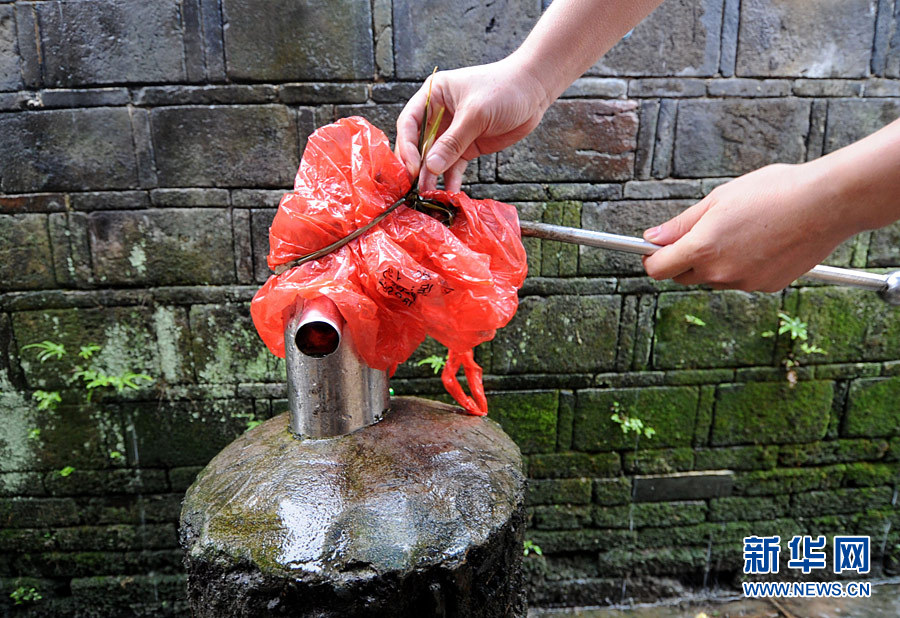 因为旱情影响,江西新建县大塘坪乡不少村民的水井无法压水,这是溪头村村民用塑料袋包裹压水器(5月22日摄)。往年的四五月份,长江中下游正紧张地防汛。但当前,湖北、江西、湖南等河流、湖泊众多的省份却出现严重旱情。据气象部门介绍,21日至24日南方地区出现一次降雨过程,长江中下游一些县市旱情有所缓解,但部分地区旱情还在持续。记者从长江水利委员会获悉,国家防总已召集有关各方,专题研究三峡水库调度工作,提出统筹兼顾防汛抗旱、水力发电与航运安全等需求,决定自5月20日起,三峡水库按日均出库10000立方米每秒左右控泄;自25日至6月10日,日均下泄流量再加大一到两千立方米每秒,以缓解中下游抗旱用水、城乡供水等压力。新华社记者 周科 摄
