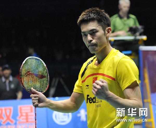 5月28日,中国选手林丹庆祝胜利,他在男子单打比赛中以2比0战胜韩国选手朴成奂。当日,在山东省青岛市举行的2011年苏迪曼杯世界羽毛球混合团体锦标赛半决赛中,中国队以3比1战胜韩国队,挺进决赛。新华社记者岳月伟摄
