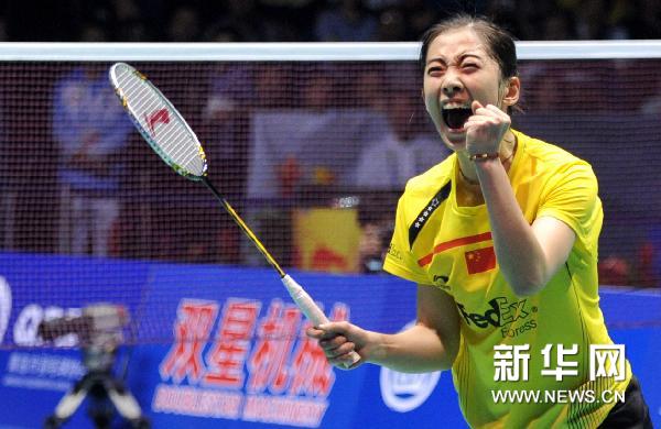 5月28日,中国选手王适娴庆祝胜利,她在女子单打比赛中以2比0战胜韩国选手裴延姝,为中国队锁定胜局。当日,在山东省青岛市举行的2011年苏迪曼杯世界羽毛球混合团体锦标赛半决赛中,中国队以3比1战胜韩国队。新华社记者岳月伟摄