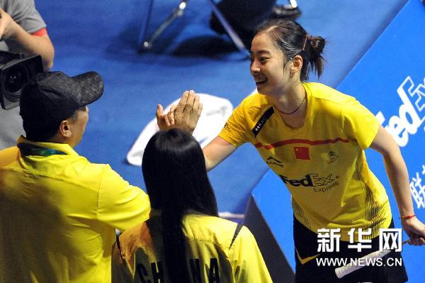 5月28日,中国选手王适娴(右)与总教练李永波(左)庆祝胜利,她在女子单打比赛中以2比0战胜韩国选手裴延姝。当日,在山东省青岛市举行的2011年苏迪曼杯世界羽毛球混合团体锦标赛半决赛中,中国队以3比1战胜韩国队,挺进决赛。新华社记者朱峥摄
