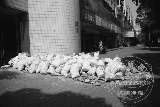 官河路682号的一幢写字楼里有许多公司,商业气息浓厚,但与之格格不入的一堆建筑垃圾却堆放在人行道上,记者数了一下,差不多有30编织袋,不仅影响市容,也影响市民出入。