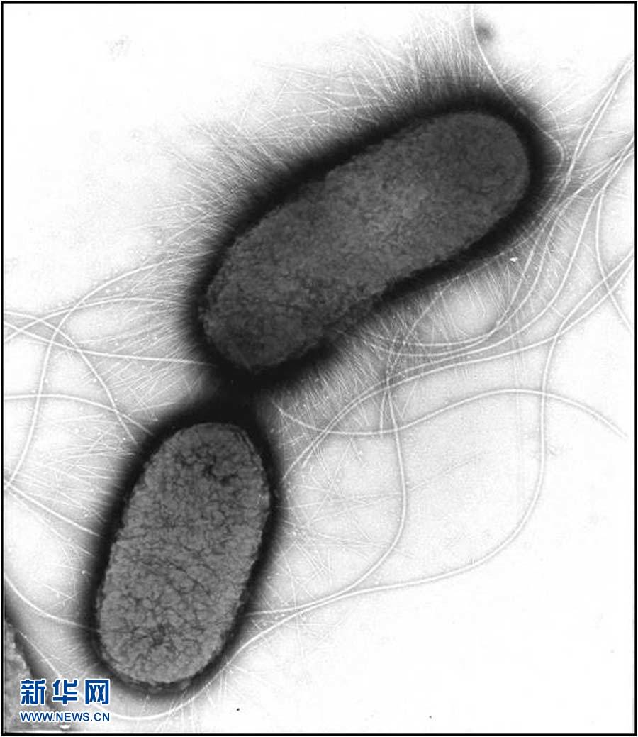 这是5月30日德国罗伯特·科赫研究所提供的肠出血性大肠杆菌的电子显微镜照片。德国卫生部门28日说,3名女子可能因食用受肠出血性大肠杆菌(EHEC)“污染”的黄瓜死亡。德国方面怀疑,大肠杆菌疫情由“毒”黄瓜引发。这些受大肠杆菌“污染”的黄瓜可能来自西班牙阿尔梅里亚省和马拉加省的两家出口商。西班牙方面已暂停两家出口商相关生产与销售。新华社/法新
