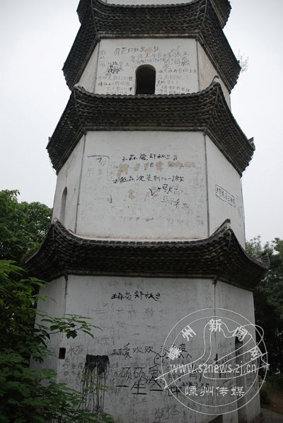记者注意到,古塔从一层到三层俨然成了一些人传情达意的“纪念墙”,塔身四面都被涂画上了各种各样的文字和符号;从拱门走进去,塔内也依然可见各种各样的涂鸦。