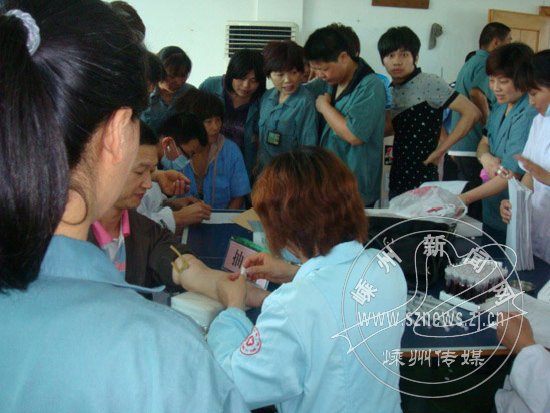 一直以来,我市将关爱外来员工放上重要议事日程,外来员工社会保险等优惠政策不断出台,外来人员居住中心的建设、“文化绿卡”的发放、“新杰出嵊州人”的评选以及多家医院发起的“关爱外来员工健康行动”计划等举措,让外来员工的幸福指数不断提高,更加激励了他们在“比学赶超、创先争优”主题实践活动中的创业热情。图为医护人员正在为“迪贝”的外来员工进行健康检查。