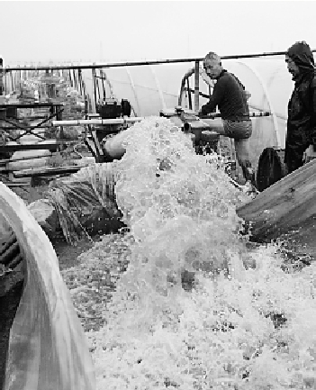 连日降水,萧山瓜地遭水淹,瓜农紧急排积水。通讯员张祥荣摄