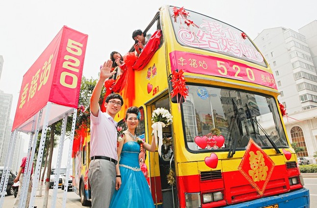 6日上午,在南中环街和体育路交叉口往北500米的一个小区门口,记者见到这辆贴着“囍”字的双层公交车,公交车的车门旁就是站牌,站牌名是“520路幸福站”。在车头二层前挡风玻璃上,贴着“我们结婚啦”的字样,公交车的车次变成520路,起点和终点站分别写着幸福站和爱情站,后车窗和右侧的车尾处贴着一对新人的结婚照,车身上有红色气球和红色彩绸,车身到处贴着“红心”和小熊,红心上写着“I LOVE YOU”、“LOVE”、“KISS”等字样。